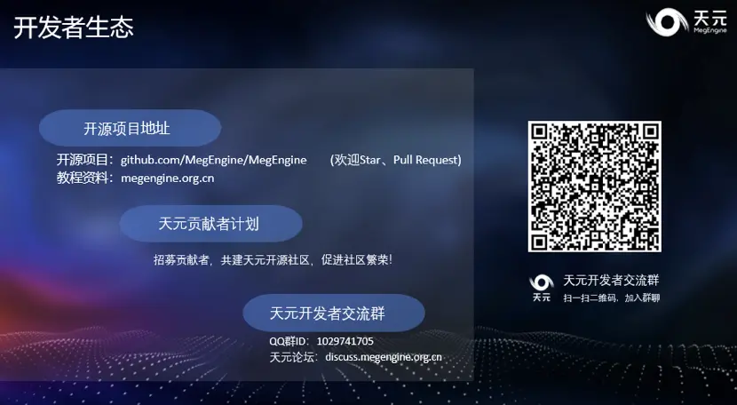 欢迎大家关注天元的 Github 项目 MegEngine,并参与贡献者计划。另外,也可以在 Github 、QQ 群或论坛中进行技术交流与讨论。