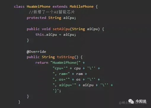 2. 创建具体的实现类,如华为手机,实现了基类的抽象方法,并扩展增加了AI智能芯片
