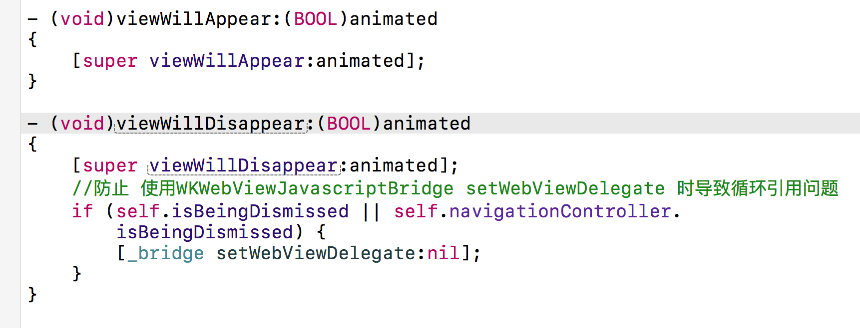这个解决方案是 WKWebViewJavaScriptBridge循环引用最简单处理办法 。但是这么处理会导致一些问题,在网路请求未拿到数据后进入其他页面,待数据加载到后回到之前页面,代理方法失效。解决方法 通过控制器的 isBeingDismiss 这个方法判断控制器来源,当控制器将要销毁时,打破循环引用。如下图: