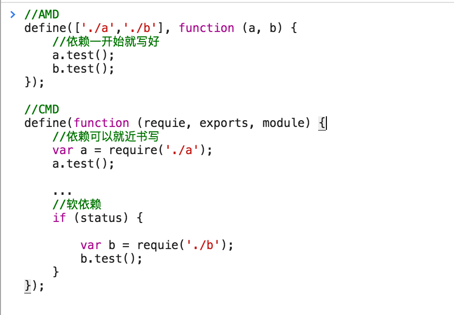 对于依赖的模块AMD是提前执行,CMD是延迟执行。不过RequireJS从2.0开始,也改成可以延迟执行(根据写法不同,处理方式不通过) CMD推崇依赖就近,AMD推崇依赖前置