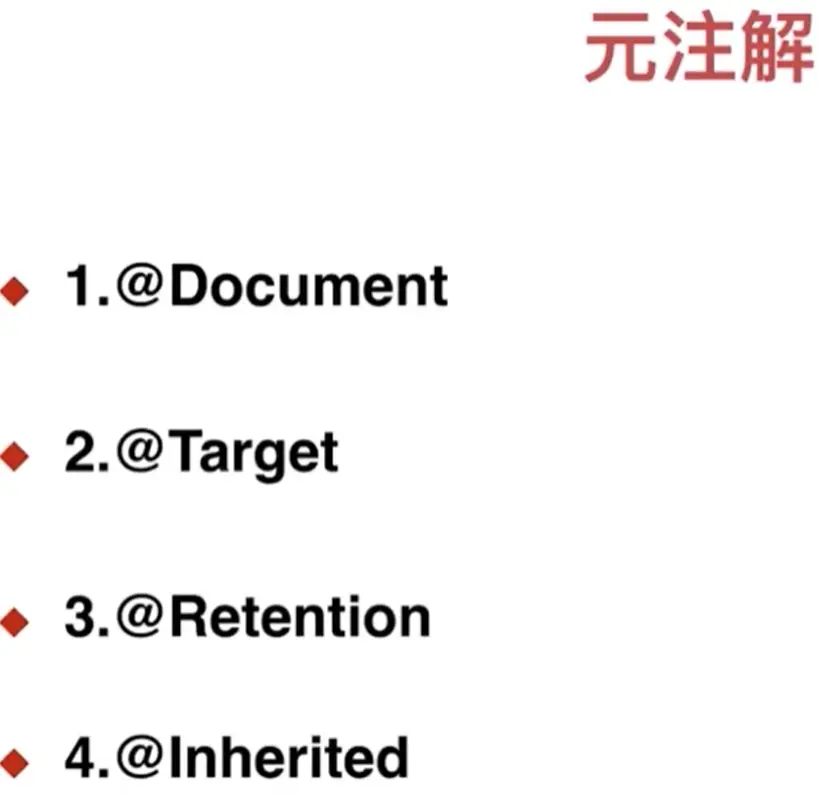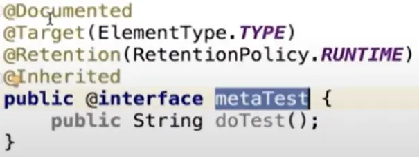 - @interface表明metaTest是一个自定义注解。然后利用上面的元注解对该自定义注解进行解释。