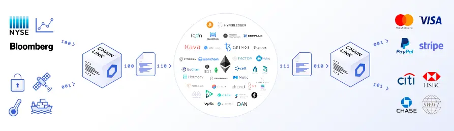 而现在我们又迎来了新一轮创新,那就是让脚本化智能合约连接到链下真实世界的数据和系统。具有外部连接性的智能合约使用一种名为预言机的中间件,连接链下数据触发合约执行。预言机还允许智能合约向其他系统发送数据,比如向传统法币支付系统发送支付指令,在链下交割智能合约。