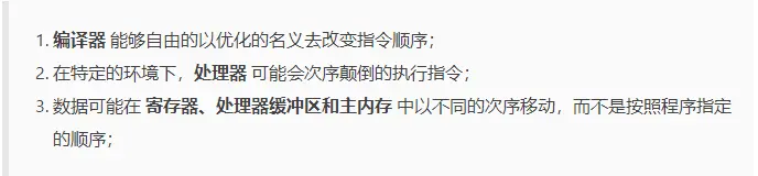 在很多情况下,访问一个程序变量(对象实例字段,类静态字段和数组元素)可能会使用不同的顺序执行,而不是程序语义所指定的顺序执行。具体几种情况,如下: