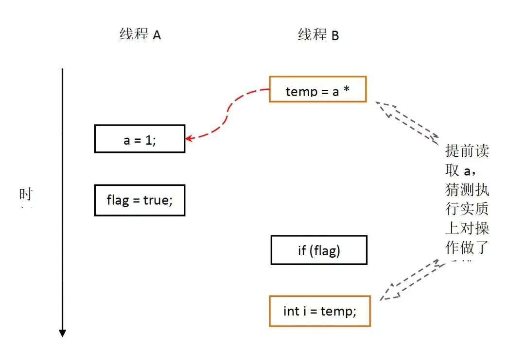 从图中我们可以看出,猜测执行 实质上对操作3和4做了重排序。重排序在这里破坏了多线程程序的语义!