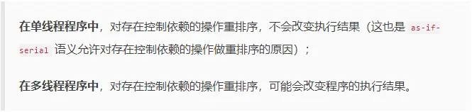 上面三种情况,只要重排序两个操作的执行顺序,程序的执行结果将会被改变。像这种有直接依赖关系的操作,是不会进行重排序的。特别注意:这里说的依赖关系仅仅是在单个线程内。