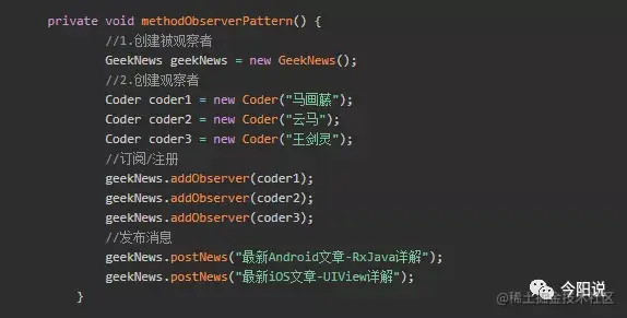 缺点:开发和运行效率,一对多调试比较复杂,而且java中的消息通知是默认顺序执行的, 一个观察者卡顿,会影响整体的执行效率,这种情况下一般要考虑异步方式