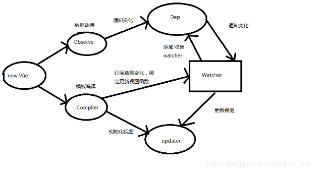 收集完成每一个watcher实例之后,当数据发生改变时又会触发Object.defineProperty的set方法,那么通过dep实例的发布函数,触发watcher的updater函数,并将新的数据传入回调函数,回调函数触发视图层更新。