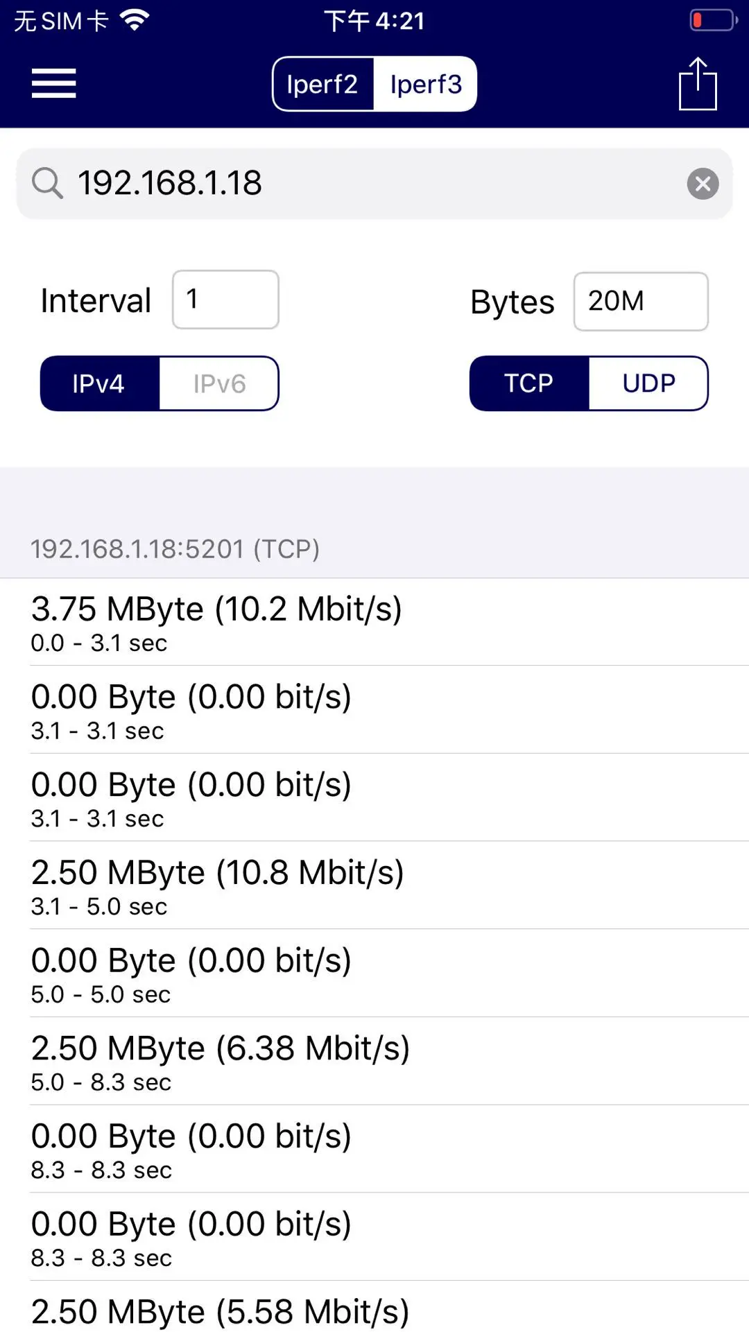 PS:IOS版本iperf3只能模拟客户端发送数据不可以发反向数据