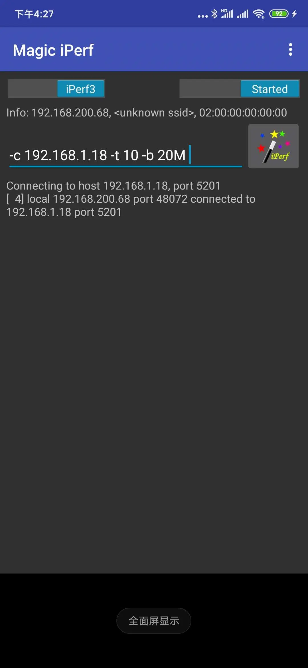 下载链接:pan.baidu.com/s/1qYB840CT… 提取码:n858 可以切换版本:iperf2和iperf3 右侧点击Started可以启动服务 安卓版本可以模拟客户端或服务端