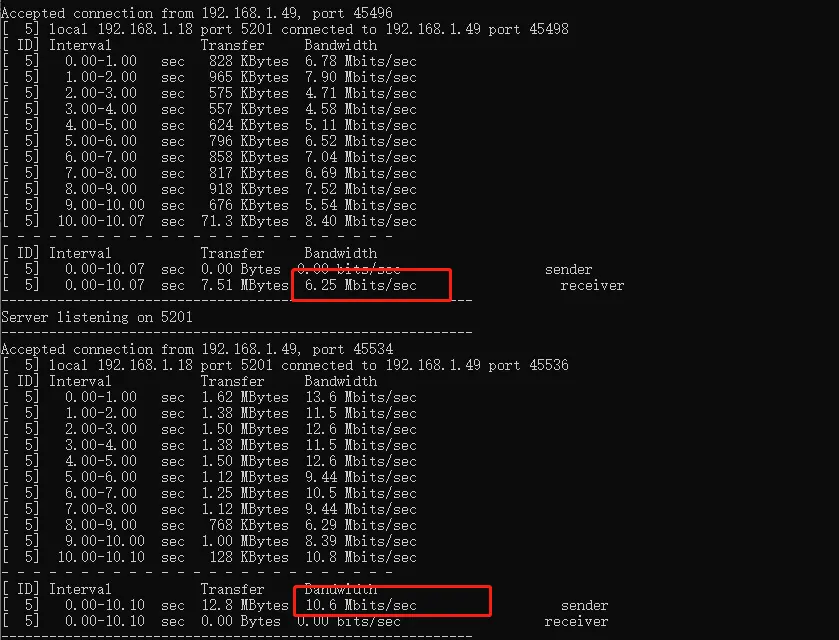 -c 192.168.1.18 -t 10 -b 20M -R(模拟从服务端下载数据到客户端)