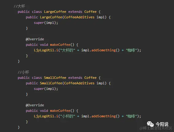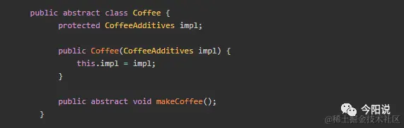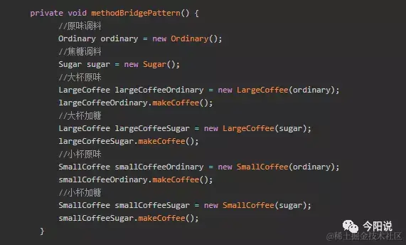 以咖啡大小杯和口味为例,不管是Coffee变化(大小杯),还是风味变化(CoffeeAdditives),其相对于对方而言都是独立的,两者唯一的联系就是Coffee中保持对coffeeAdditives的引用,为二者间的纽带,这就是桥接模式
