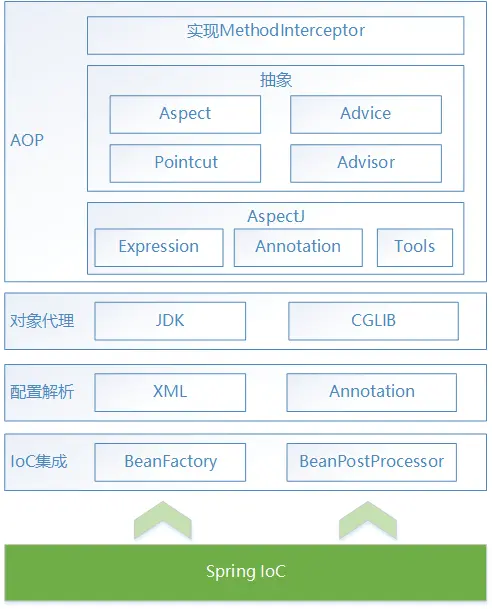 - 抽象层,包括了Spring对AOP概念的封装和抽象,重点理解一下Advisor,这是Spring独有的概念;
