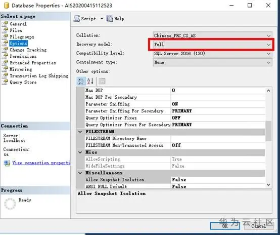 选中数据库,右键数据库属性->选项,选择恢复模式为full 模式