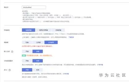 选择华为云对象存储服务(OBS)。创建一个标准存储、公共读写的桶。
