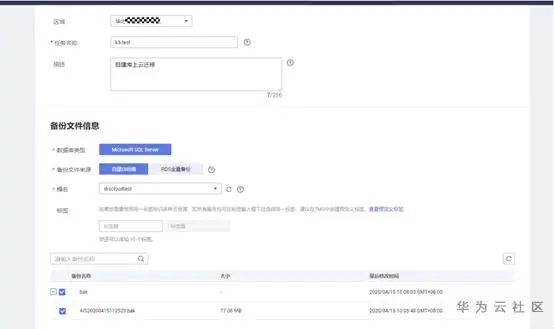 跳转到数据复制服务,选择备份迁移管理,创建迁移任务,选择数据库类型为SQL Server,备份文件来源为自建OBS桶,选择桶名,找到上传的备份文件,点击下一步。