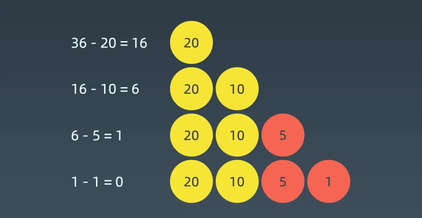 当硬币可选集合固定:Coins = [20, 10, 5, 1]