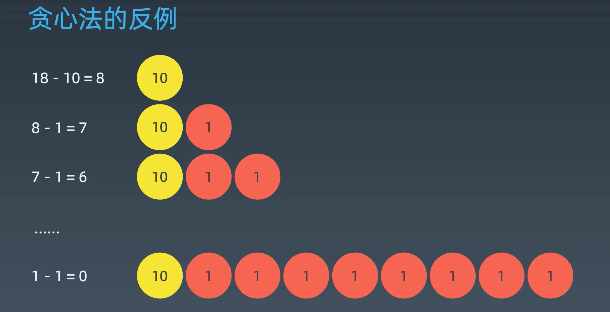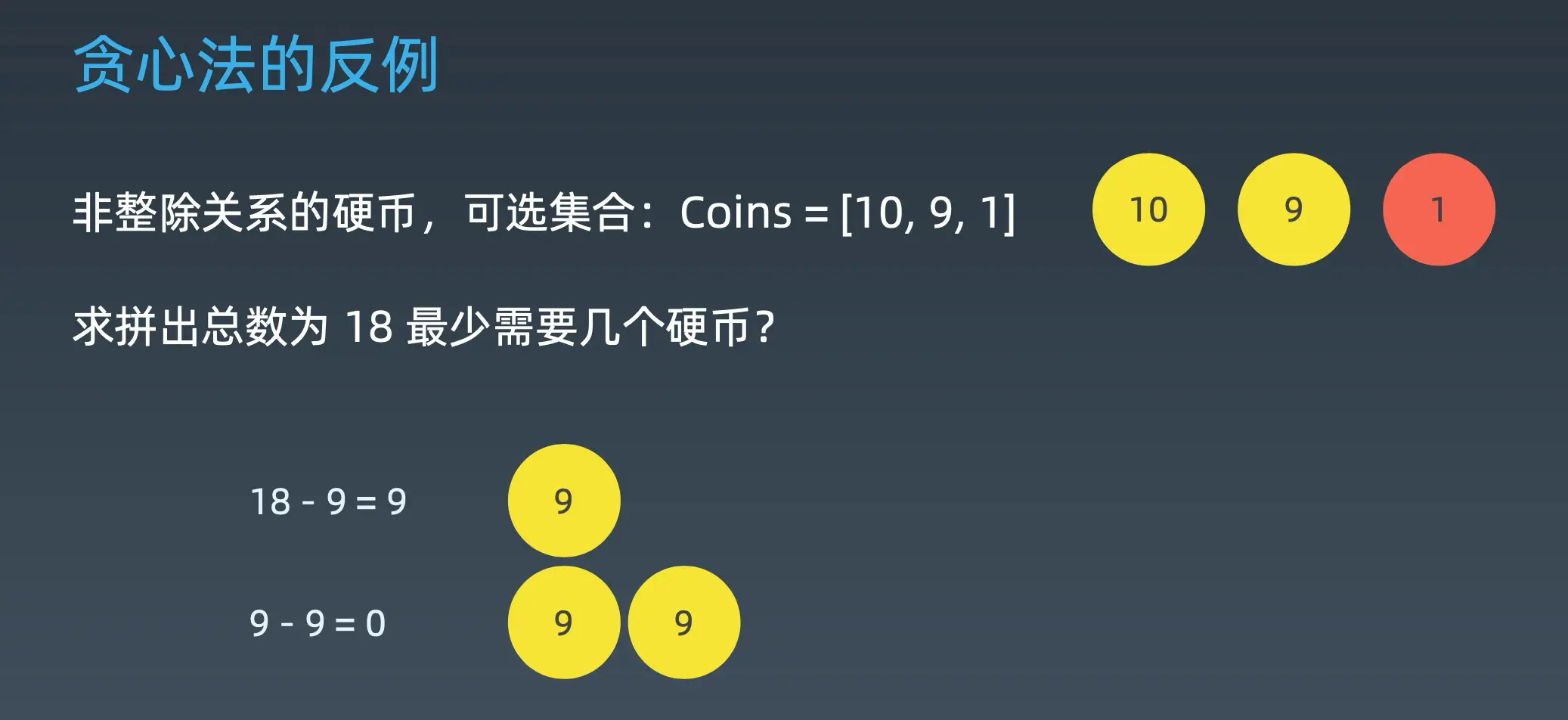 但是要举出反例的话也是很容易的,这里的话用贪心法的一个特点就是有它所谓的特殊性。这里的特殊性指的是这个硬币的话有整除的关系。所以能用贪心法,但是在大部分情况下,其实不能用贪心法的。假设这个硬币不再是 20 10 5 1这种有整除性关系的时候。这里举一个反例: