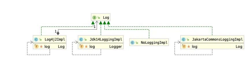 在 tryImplementation ,中会设置mybatis使用的log类型。把引用的log设置到logConstructor中后,后续其他类型的log也不会再加载。所以在mybatis中优先级由低到高为slf4J、commonsLoging、Log4J2、Log4J和JdkLog。感觉也是属于SPI的一种实现方式,不同的是各种类型的第三方日志,无法形成一个统一的接口。故此,mybatis为了解决这一问题,使用了适配器模式。