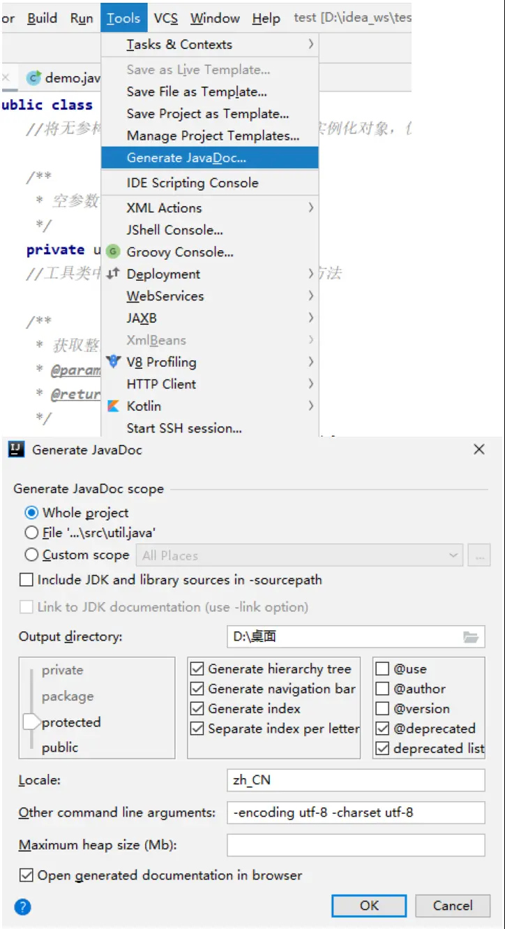 接下来,将.class文件发送给其他人,让其他人也可以使用这个工具类,只要将给文件设置到classpath路径下,就可以使用该工具类。但是该类之中到底定义了什么方法,对方并不清楚,接下来开始制作程序的说明书。java的说明书通过文档注释完成! 再命令行窗口使用javadoc命名可以自动生成说明文文档,再idea中可以通过tool下的: