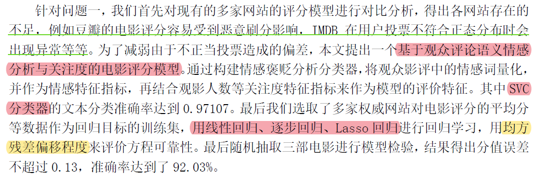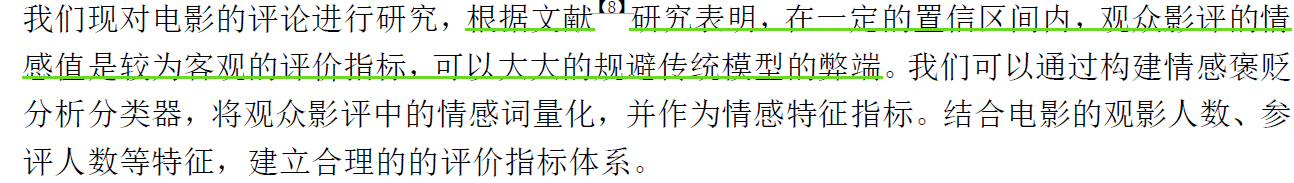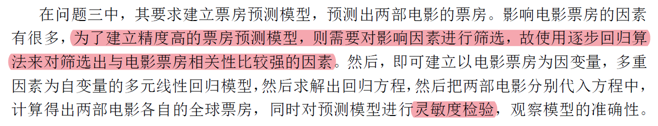 校赛优秀论文1 电影评分与票房预测分析 赤西沽 2020-07-14 161 阅读1分钟 【注】红色高亮代表可以学习的亮点 摘要 问题一: 他说的不太对,观众的情感,就和主观评分是一样的,不客观;他选取的指标没有考虑电影本身的因素 问题二: ?? 问题三: