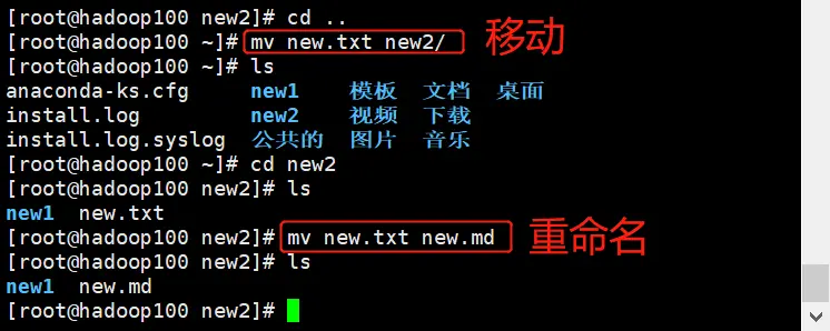 案例:将new.txt移动到new2目录,并修改new.txt为new.md