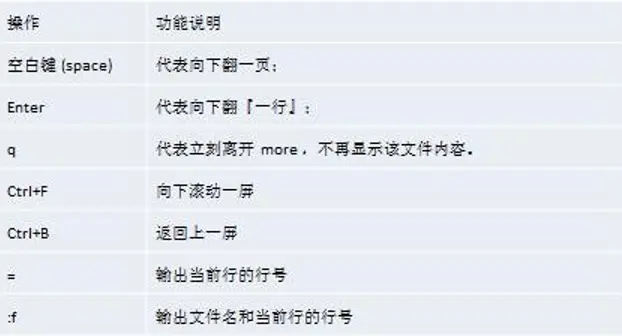 描述:more 指令是一个基于 VI 编辑器的文本过滤器,它以全屏幕的方式按页显示文本文件的内容。more 指令中内置了若干快捷键。