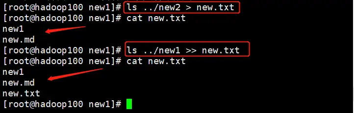 案例:new2内文件(覆盖)写入new.txt; new1内容追加到new.txt;