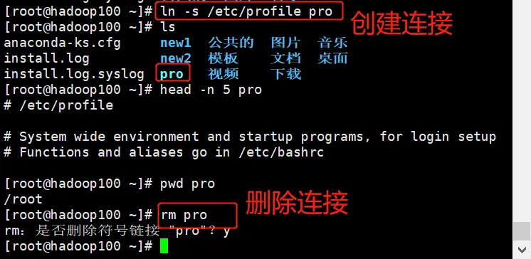案例:为 /etc/profile 创建软连接pro; 删除软连接