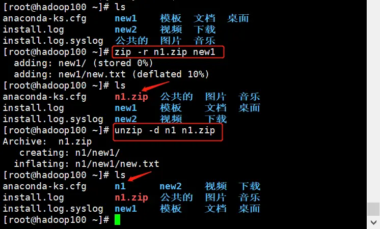 案例:将new1压缩到n1.zip,将n1.zip解压到n1