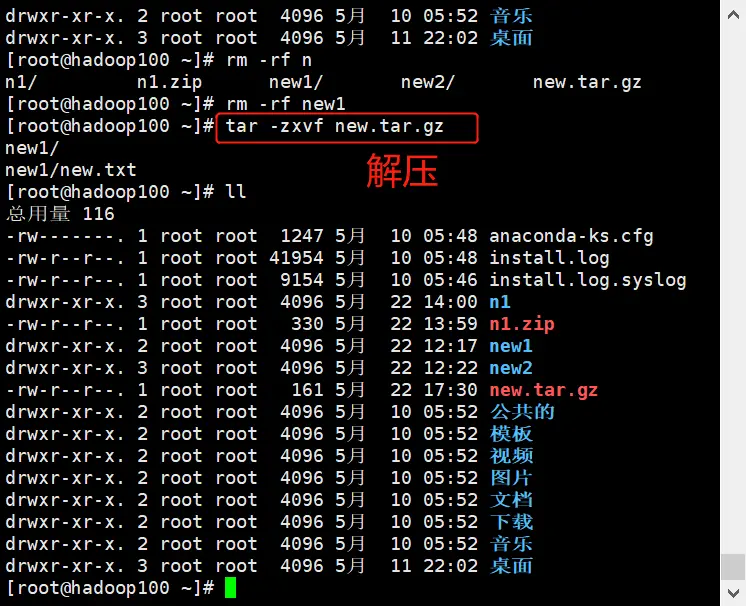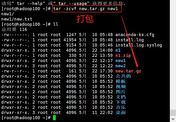 案例:将new1打包到new.tar.gz; 删除new1; 解压new.tar.gz