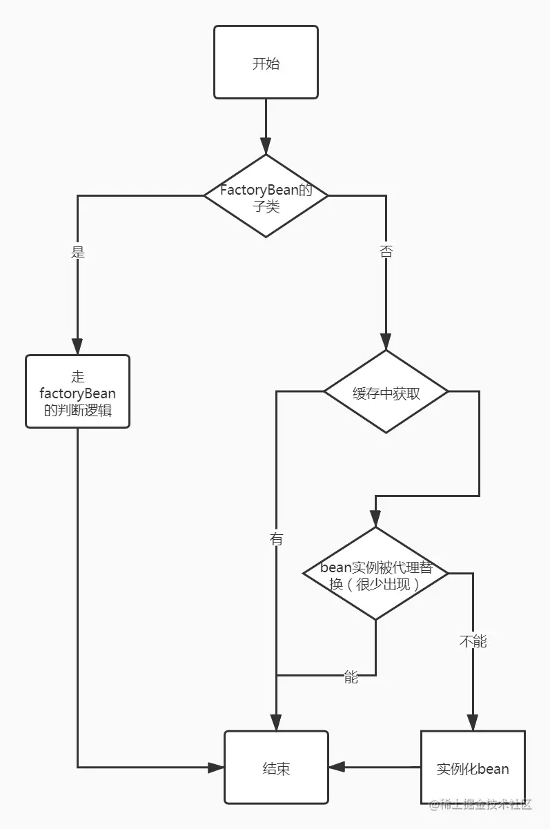 getObjectForBeanInstance(sharedInstance, name, beanName, mbd),如果实例化bean是FactoryBean实现类则调用getObject()返回对象,否则返回实例化完成的bean - 所有bean实例化完成以后,如果有bean是