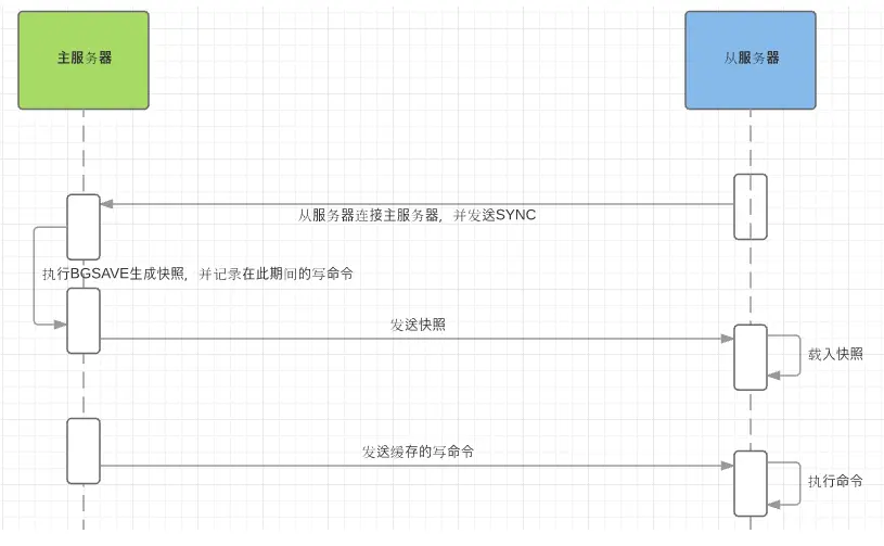 master 执行 BGSAVE 命令,生成一个 RDB 文件, 发送给 slave , slave 加载 RDB 文件达到与 master 维持一致。