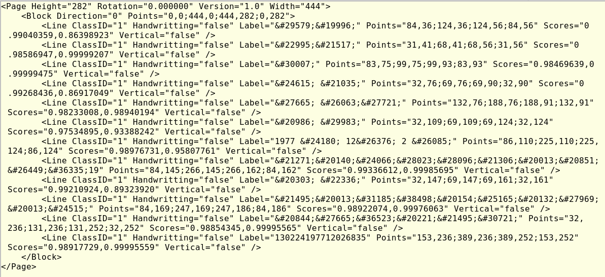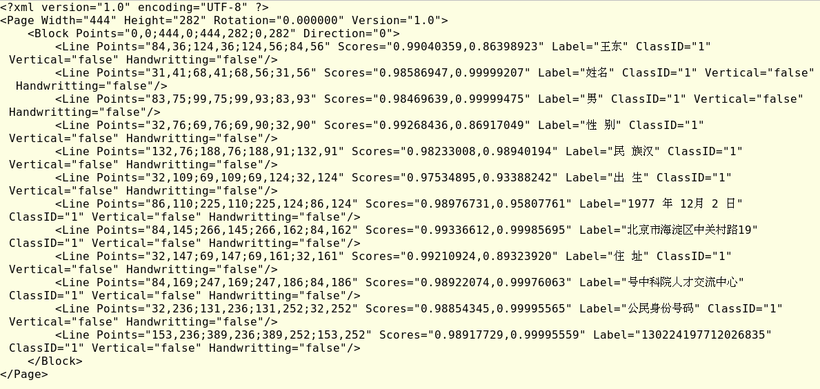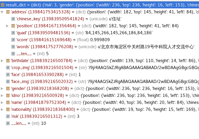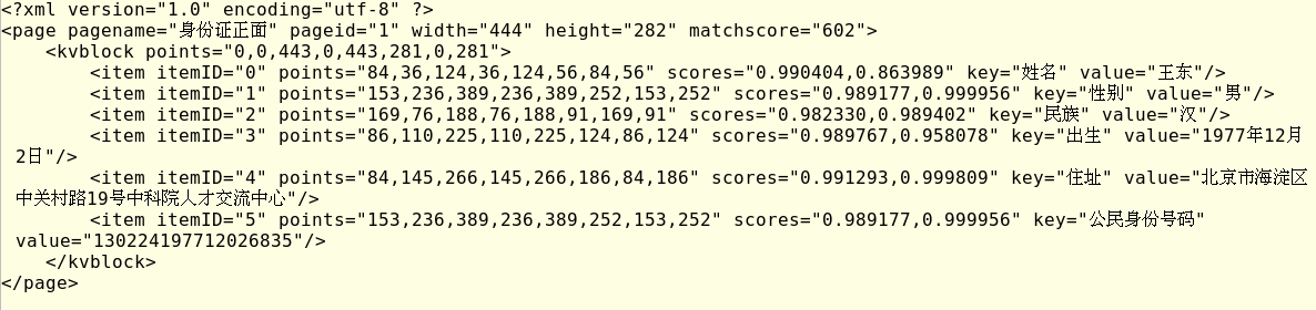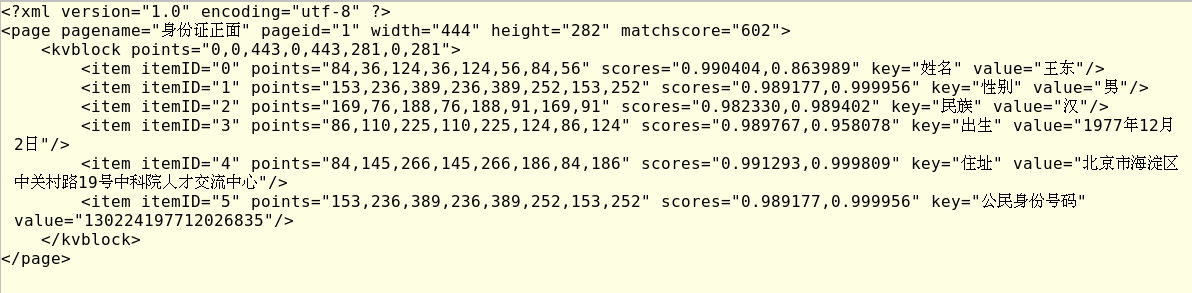 身份证v1 sdw 2020-07-15 142 阅读1分钟 raw_xml = recognize_type(type_ids[type_idx][1], uploaded_file) -- recognize.py - line284 page_xml result_buffer result_xml = str(result_buffer.raw[0:xml_length]) result_dict -- kvblock遍历整理 最终返回 result_dict