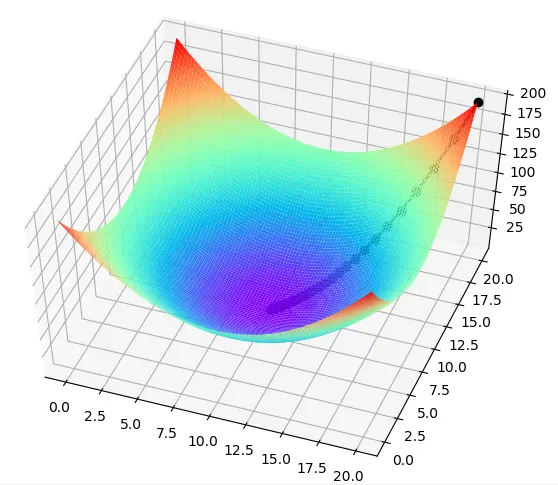 可见迭代到后面得到的是函数的极小值(也是最小值),并且此时自变量的值也知道。为了有一个更加直观的展示,我们对上述代码进行改写,加上画图后的代码如下所示:
