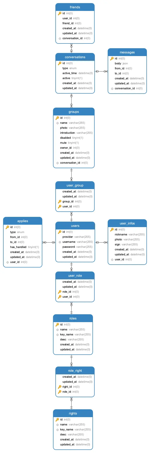 完成一个即时通讯应用,需要考虑的第一个事情就是会话,就是我们微信里面的对话窗口。思考会话和消息、用户、群组之间的关系花费了不少的精力,最终形成以下的基本关系:
