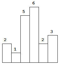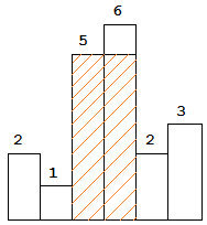 比如上图当中,我们有6个矩形,它们的宽度都是1。我们能找到的最大矩形应该是中间5和6围成的矩形: