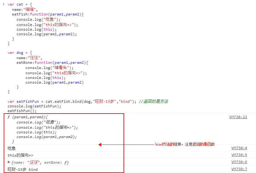 var eatFishFun = cat.eatFish.bind(dog,"旺财-13岁","bind"); //返回的是方法