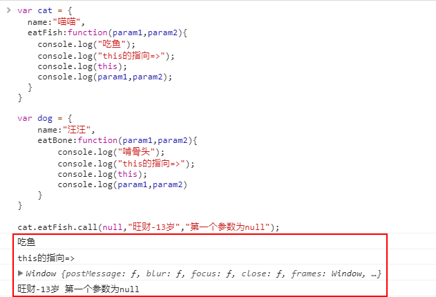 cat.eatFish.call(dog,"旺财-13岁","call");