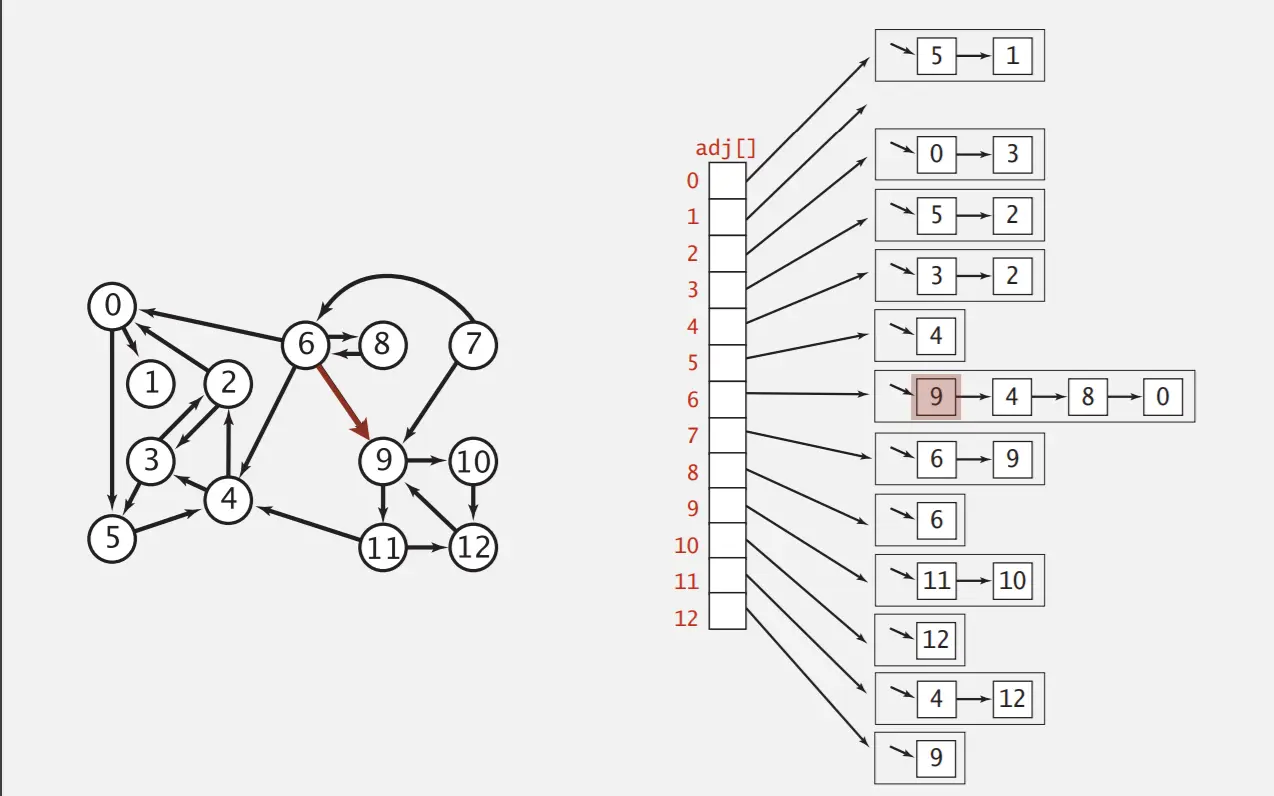 我们依然使用邻接表存储有向图,其中v-->w表示为顶点v的邻接链表中包含一个顶点w。注意因为方向性,这里每条边只出现一次!