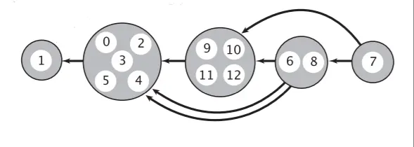 有了方向,那么接下来,我们来看一幅真实的有向图案例,如图二所示,这是一幅有向图,它的各个强连通分量在图中用灰色标记;我们的操作是将每个强连通分量看成一个顶点(比较大而已),那么会产生什么后果呢?我们的原始的有向图就会变成一个有向无环图!