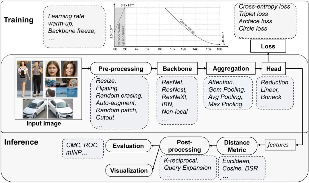 上图已经完整列出了FastReID各个模块,上下分别为训练和推理。