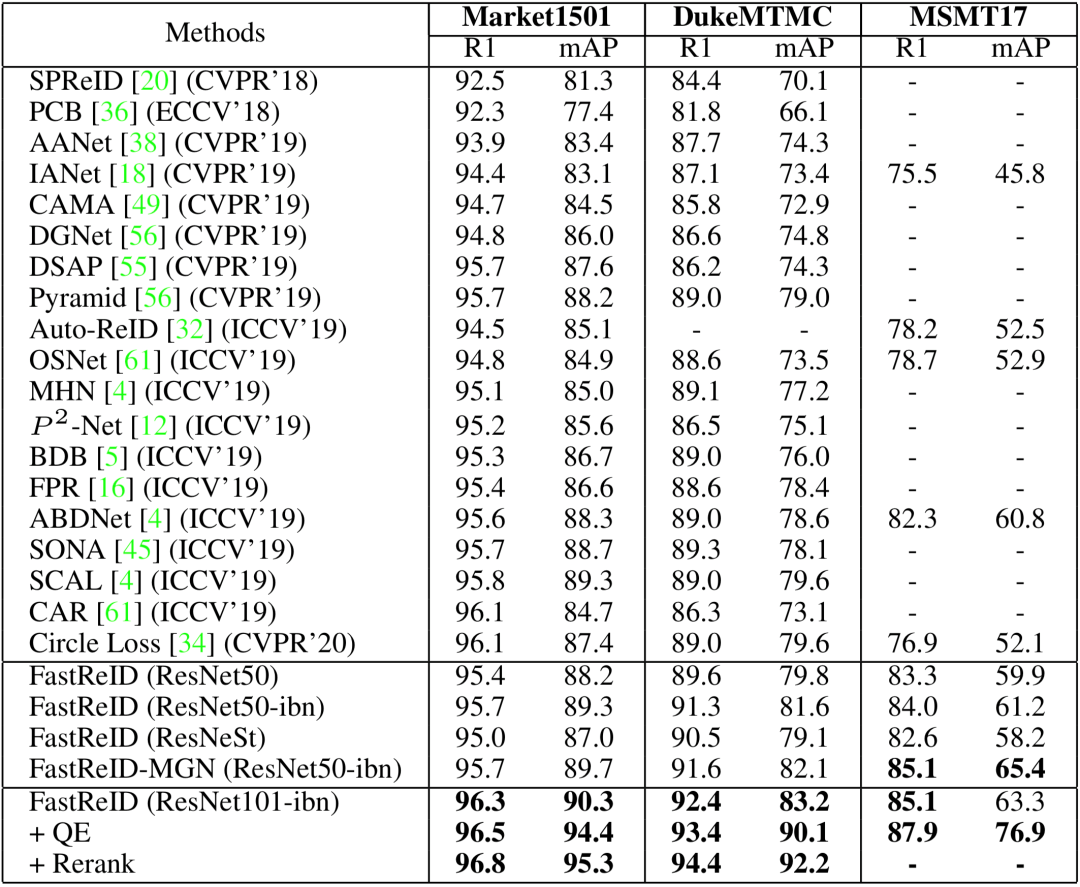 表一:FastReID在三大数据库上的结果