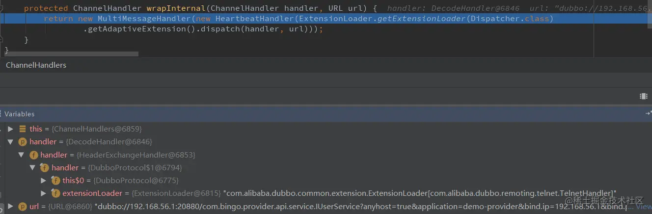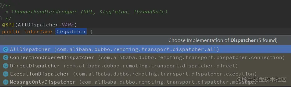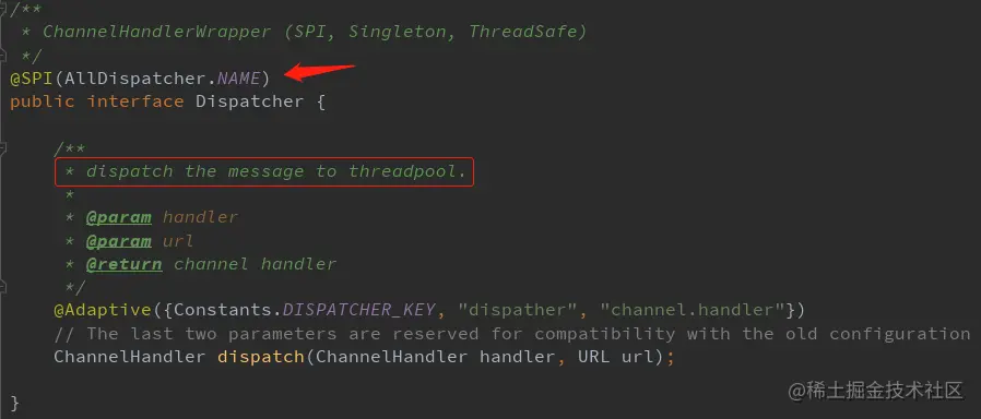 这行代码主要是基于SPI机制加载线程模型分发策略的具体实现 (Dispatcher 默认线程为 all)