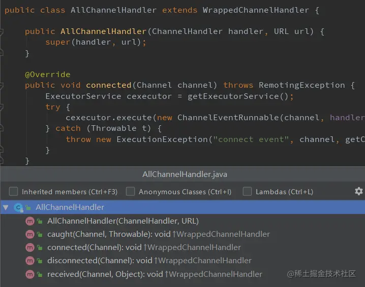可以看到 AllChannelHandler 中有一些 接收、连接、异常捕获等方法,是否可以大胆假设,这些就是消费方调用时执行真正处理的方法 ?