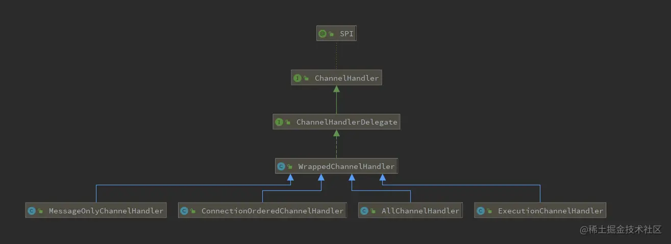 这里调用了父类 WrappedChannelHandler 有参构造器,再来一张图看一下 ChannelHandler 的关系: