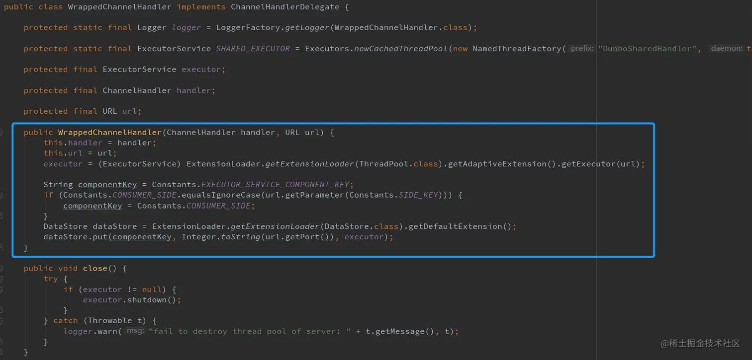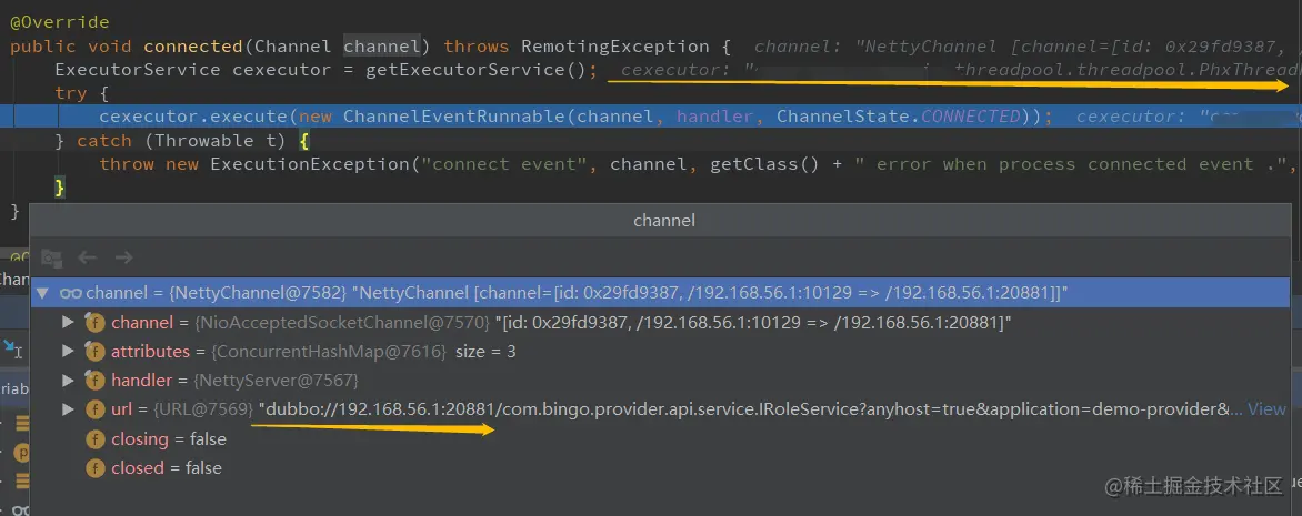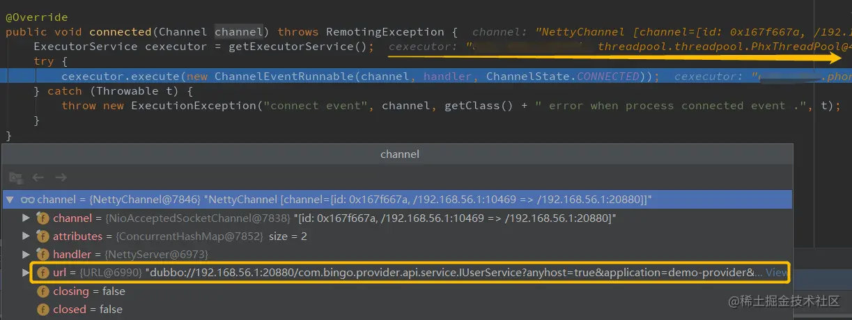 URL中带有提供者自定义的一些属性,上述逻辑会先从url中获取 threadPool 属性,如果获取不到则默认使用fixed,之前我们在xml中配置为 custom ,拿到该属性名称后,会从 ExtensionLoader 的属性中获取之前创建好的 CustomThreadPool 对象,并且调用其 getExecutor 方法,执行我们自定义的一些逻辑。
