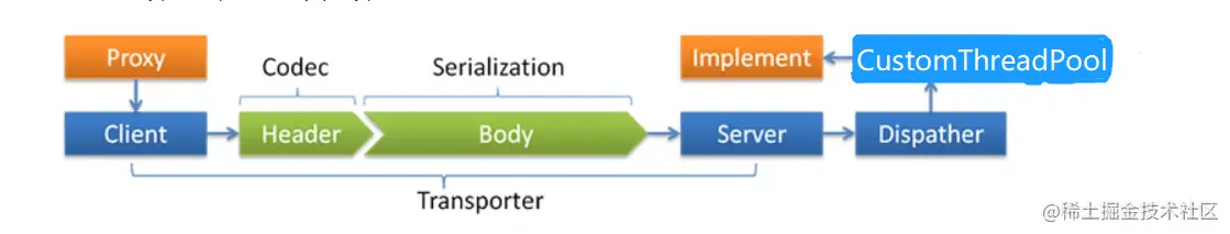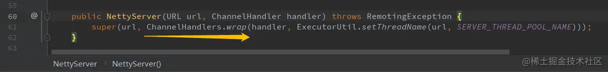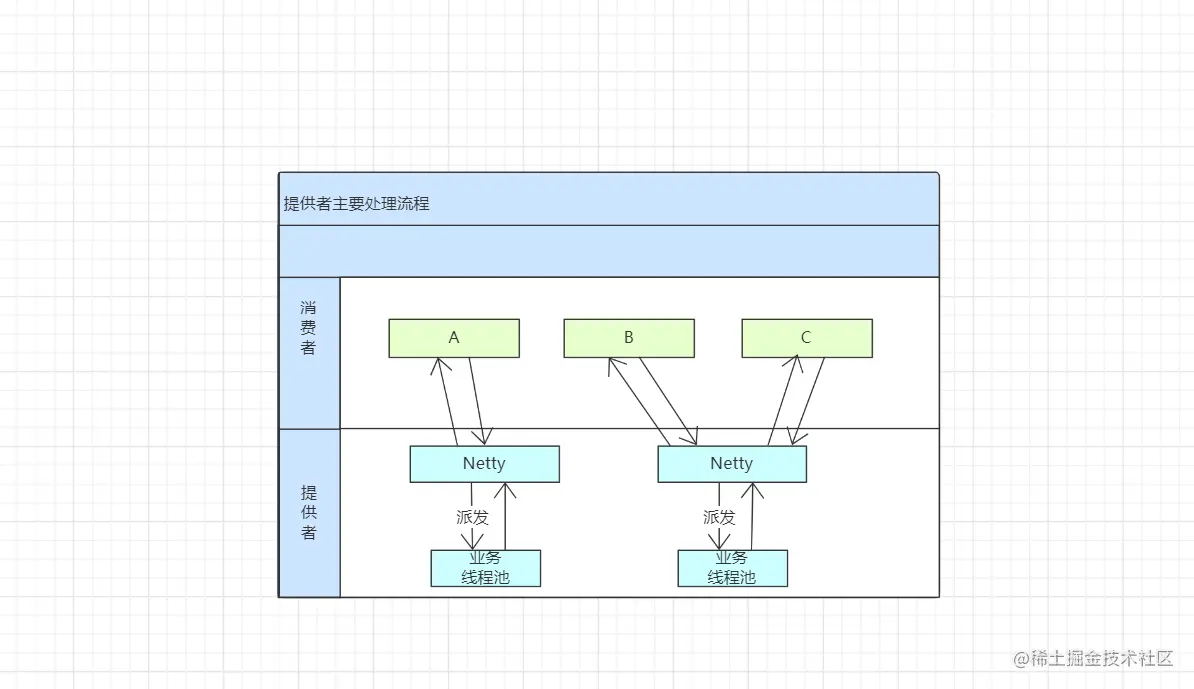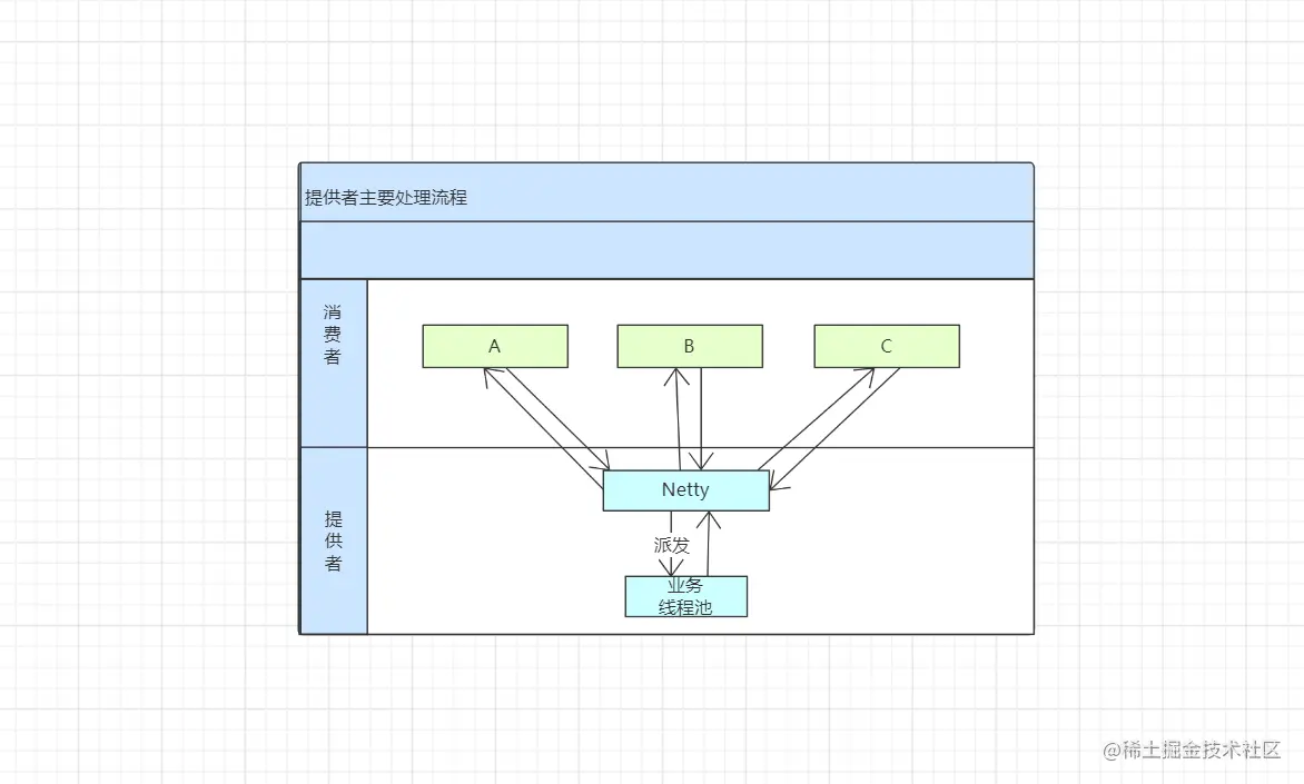 服务接收到请求后,会委派到上图的 NettyHandler 中进行处理; 即刚才包装过的 ChannelHandler 对象