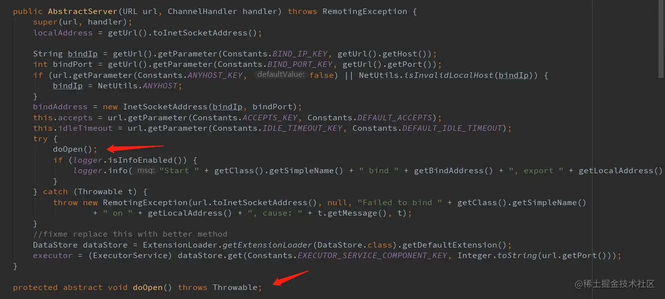 进入父类中,除了参数获取赋值外,重点关注 doOpen 方法,可以看到调用了本类抽象的方法;