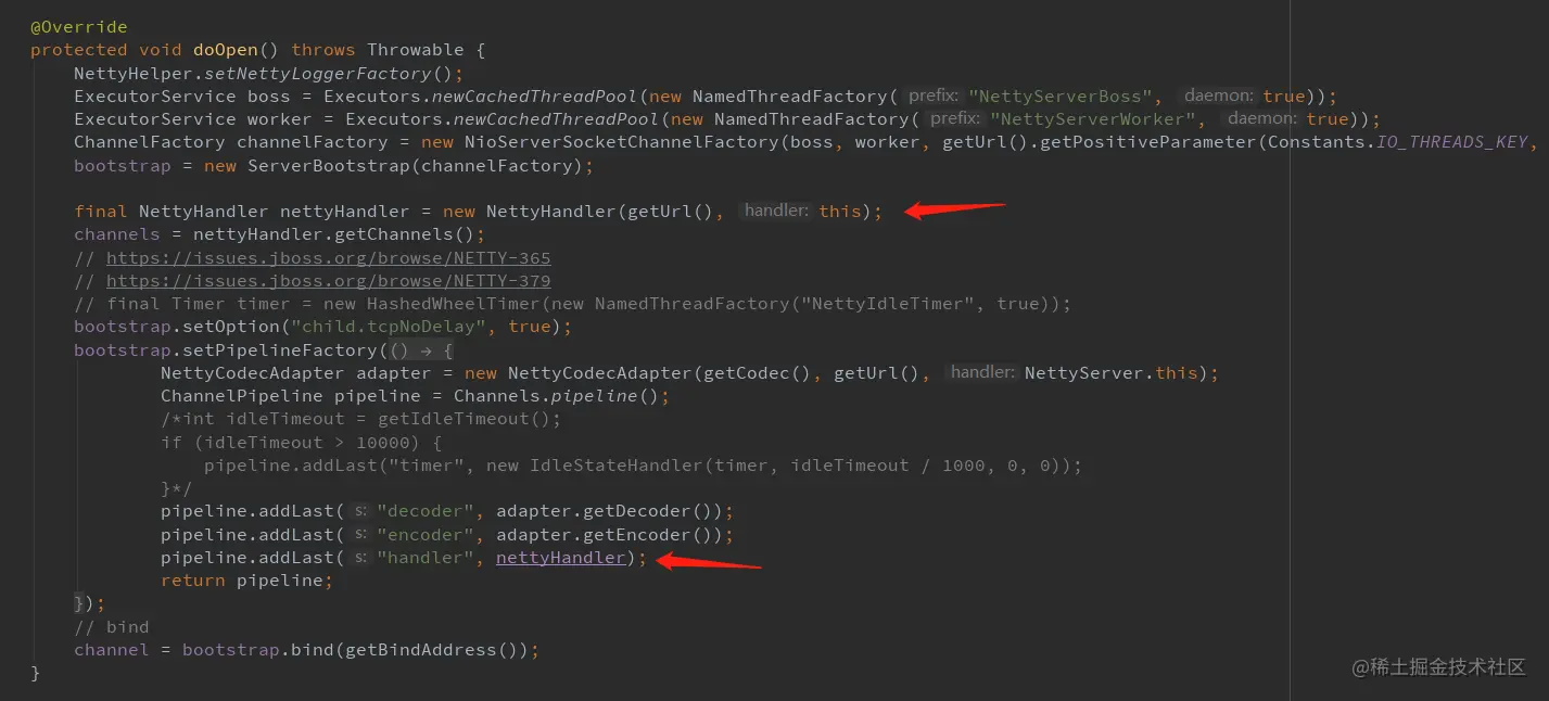 这里使用了钩子方法,重新进入子类 NettyServer 的 doOpen 方法;