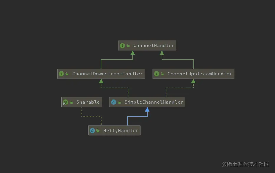 NettyHandler 类关系图可以看到实现了处理IO事件的 SimpleChannelHandler, 并且重新覆写了部分逻辑处理的关键方法;